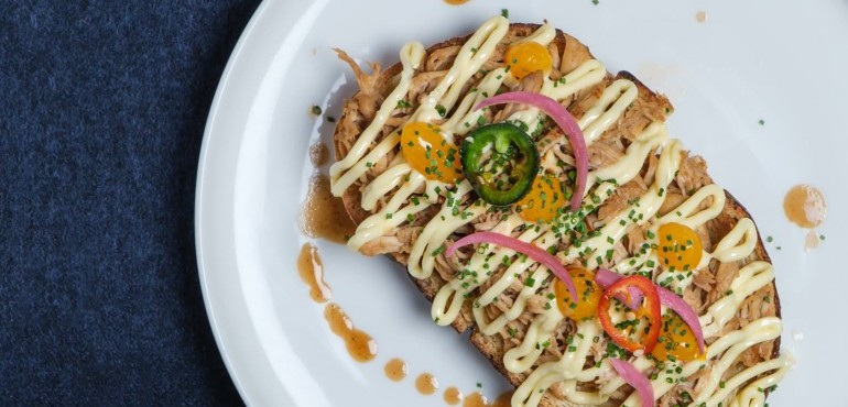 Poulet, oignons pickles, mayonnaise maison,