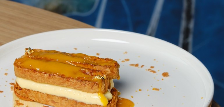 Feuilletage caramélisé, crème à la vanille et coulis exotique